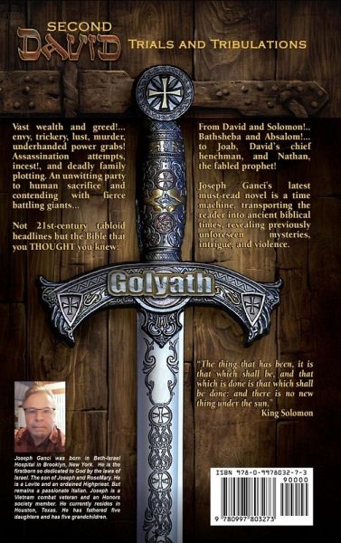 PROLOGUE Second David, Trials and Tribulations This book covers Second Samuel 12:31 through First Kings 2:1 This book picks up where David God's Chosen Crucible leaves off. There is a natural break in his story at this point. David is at the height of his power and acclaim. He has married his soulmate Bathsheba, who is pregnant with his unborn child. He made the child legitimate by killing Bathsheba's husband, Uriah the Hittite. He married her when she became an available widow. David believes he has eluded both the judgment of men and God's Judgment. David stated that since it was the sword of Amon and not him directly, claiming that "The sword of war devours one as well as another," allowing him to proclaim innocence. He is now the master of a huge domain, the empire of Israel. This feat surpasses his imagination of greatness. At a feast celebrating all that he had accomplished. Nathan the Prophet enters and asks David for a judgment. Nathan tells of two men, one rich with flocks and herds and a poor man with one ewe lamb that he treated like family and ate at his table. The rich man took the poor man's one ewe lamb and dressed it for the stranger. He asks David, "What would you do to this rich man who took the poor man's one ewe lamb." In self-righteous anger, David proclaimed, "I would have him killed and make him pay it back four times." Nathan looks at David squarely, points to him, and accusingly announces, "You are the man, and the sword will never leave your house." Nathan's fable tricks David, and he Judges himself and sets his punishment. Is this not how, when standing in front of God with our perfect knowledge of our sins, we judge ourselves and announce the punishment to set the scales of justice aright, For mercy cannot rob justice? Vast wealth and greed!... Envy, trickery, lust, murder, and underhanded power grabs! Assassination attempts, Incest!, and deadly family plotting. An unwitting party to human sacrifice and contending with fierce battling giants. As a novelist, I use poetic license to depict events I imagine could have happened. I use well-researched details consistent with the human mind, will, and emotions for the era: geography, local customs, rumors, legends, and the ever-dark spin of power politics. 5.0 out of 5 stars Intriguing. Detailed. A Great Story Reviewed in the United States on March 3, 2022 Verified Purchase Joseph Ganci writes Biblical narratives. This means that he takes short passages and stories from scripture -- and, because he understands the language, culture, geography, and history of the subject so well, he weaves a fantastic novel that adds in the intrigue, and heartache, the tough choices, and the "feel" of what it's like to be in that place and time. Mel F. 4.0 out of 5 stars Extremely thought-provoking Reviewed in the United States on May 7, 2022I am still thinking about this book after a week. That is probably a good sign. It is very interesting to see this story brought forward with so much detail. Ron F Verified Purchase Well written. Once I started reading hard to put down