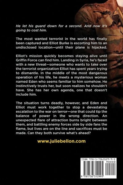 He let his guard down for a second. And now it's going to cost him. The most wanted terrorist in the world has finally been captured and Elliot Burke is escorting him to an undisclosed location---until their plane is hijacked. Elliot's mission quickly becomes staying alive until Griffin Force can find him. Landing in Syria, he's faced with a new threat---someone who wants to take over the terrorist organization Elliot has spent years trying to dismantle. In the middle of the most dangerous operation of his life, he meets a mysterious woman named Eden who seems familiar to him somehow. He instinctively trusts her, but soon realizes he shouldn't have. She has her own agenda, one that doesn't include him. The situation turns deadly, however, and Eden and Elliot must work together to stop a devastating escalation to the war on terror---one that could tip the balance of power in the wrong direction. An unexpected flare of attraction burns bright between them, and battling enemy forces side by side fans the flame, but lives are on the line and sacrifices must be made. Can they both survive what's ahead?