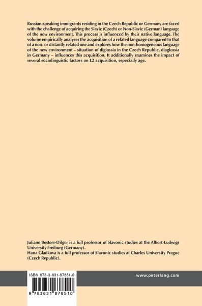 Russian-speaking immigrants residing in the Czech Republic or Germany are faced with the challenge of acquiring the Slavic (Czech) or Non-Slavic (German) language of the new environment. This process is influenced by their native language. The volume empirically analyses the acquisition of a related language compared to that of a non- or distantly related one and explores how the non-homogeneous language of the new environment - situation of diglossia in the Czech Republic, diaglossia in Germany - influences this acquisition. It additionally examines the impact of several sociolinguistic factors on L2 acquisition, especially age.