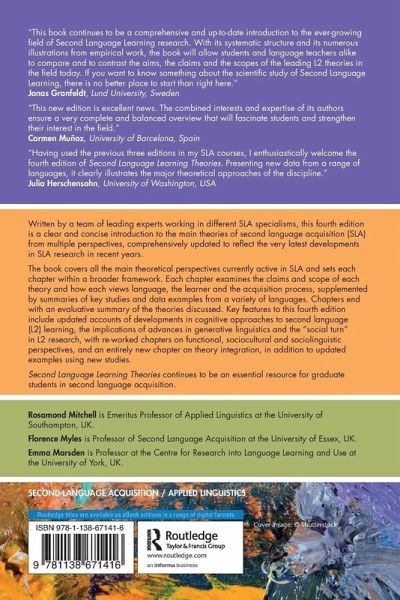 The book covers all the main theoretical perspectives currently active in SLA and sets each chapter within a broader framework. Each chapter examines the claims and scope of each theory and how each views language, the learner and the acquisition process, supplemented by summaries of key studies and data examples from a variety of languages. Chapters end with an evaluative summary of the theories discussed. Key features to this fourth edition include updated accounts of developments in cognitive approaches to second language (L2) learning, the implications of advances in generative linguistics and the "social turn" in L2 research, with re-worked chapters on functional, sociocultural and sociolinguistic perspectives, and an entirely new chapter on theory integration, in addition to updated examples using new studies.