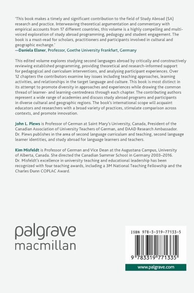 Chapter 1: Introduction: Shifting attention to second language study abroad programming, pedagogy and participant engagement; John L. Plews and Kim Misfeldt.- Part 1: Curriculum and design.- Chapter 2: Positioning year-long study abroad at the centre of the modern languages curriculum: Supporting and assessing learning; Penny Johnson and Simon McKinnon.- Chapter 3: Lessons from 25 years of experimenting with Arabic study abroad: Programme evaluation, culture, location, and curriculum; Matthew T. Bird and R. Kirk Belnap.- Chapter 4: Student-centred second language study abroad for non-traditional sojourners: An Anglophone Caribbean example; Ian Craig.- Part 2: Pedagogical approaches.- Chapter 5: Student awareness of teaching and learning approaches in second language study abroad; John L. Plews, Kim Misfeldt and Feisal Kirumira.- Chapter 6: Increasing student engagement during study abroad through service learning: A view from Japan; Dawn Grimes-MacLellan.- Part 3: Participant experiences and engagement.- Chapter 7: Exploring intercultural learning and second language identities in the ERASMUS context; Ana Beaven and Claudia Borghetti.- Chapter 8: 'I thought I was prepared'. ERASMUS students' voices on their transition from L2 learners to L2 users; Sònia Mas-Alcolea.- Chapter 9: Language teachers on study abroad programmes: The characteristics and strategies of those most likely to increase their intercultural communicative competence; Deborah Corder, Annelies Roskvist, Sharon Harvey, and Karen Stacey.- Chapter 10: Adopt a Class: Engagement and reflection during the year abroad; Elizabeth A. Andersen and Sophie Stewart.- Chapter 11: Second language speaking and intercultural friendship formation in study abroad: Experiences and perspectives of international students in the USA; Rebecca K. Smith.- Chapter 12: Gender as a cultural and social construct in language learning during study abroad; Mar Galindo.