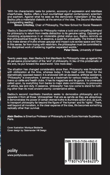 "Badiou's Second Manifesto for Philosophy makes a lucid and compelling demand for philosophy to return from media distraction to its genuine calling. Opposing all moralizing acquiescence in an intolerable global status quo, Badiou reminds us that philosophical thought is, in essence, a quest for universality. The thinker's task is to make sense of truths whose upsurge and impact cuts across space and time. In this sense, far from toying with relativism, the philosopher must be committed to the disciplined work of soldering together separated worlds." -- Peter Dews, University of Essex