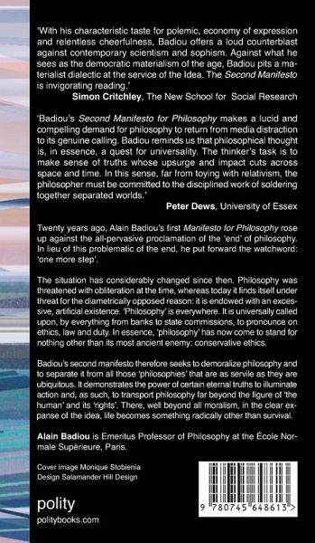 "Badiou's Second Manifesto for Philosophy makes a lucid and compelling demand for philosophy to return from media distraction to its genuine calling. Opposing all moralizing acquiescence in an intolerable global status quo, Badiou reminds us that philosophical thought is, in essence, a quest for universality. The thinker's task is to make sense of truths whose upsurge and impact cuts across space and time. In this sense, far from toying with relativism, the philosopher must be committed to the disciplined work of soldering together separated worlds." -- Peter Dews, University of Essex