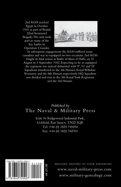 2nd RGH reached Egypt in October 1941 as part of British 22nd Armoured Brigade. The unit took part in many of the key battles in Operation Crusader. In subsequent engagements the RGH suffered many casualties and was re-equipped on two occasions. 2nd RGH fought its final action at Battle of Alam el Halfa, on 31 August to 5 September 1942. Expecting to be re-equipped the regiment was instead disbanded with 'F', 'G' and 'H' Squadrons transferred to the 4th Hussars, Royal Wiltshire Yeomanry and the 8th Hussars respectively. HQ Squadron was divided and sent to the 5th Royal Tank Regiment and the 3rd Hussars.