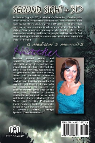 In Second Sight in 3D, A Medium`s Memoirs, Heather talks about some of her heartfelt connections from deceased loved ones on the other side. She gives a 360 degree look into what goes on in these sessions; touching on what it is like for her giving these emotional messages, the healing the client receives in a reading, and how the people on the other side feel about having a chance to connect with their loved ones who were left behind.