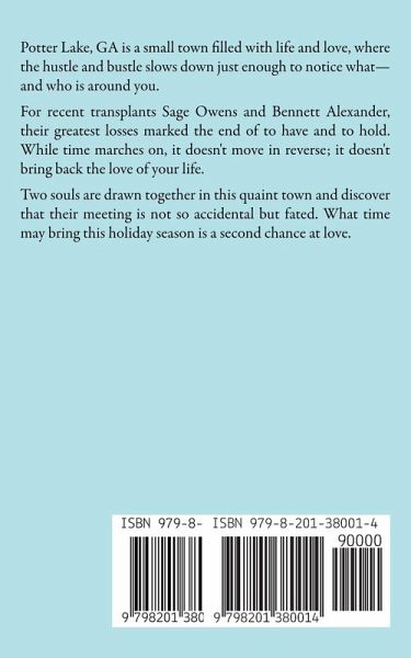 Potter Lake, GA is a small town filled with life and love, where the hustle and bustle slows down just enough to notice what- and who is around you. For recent transplants, Sage Owens and Bennett Alexander, their greatest losses marked the end of to have and to hold. While time marches on, it doesn't move in reverse; it doesn't bring back the love of your life. These two souls are drawn together in this quaint town and discover that their meeting is not so accidental but fated. What time may bring this holiday season is a second chance at love.