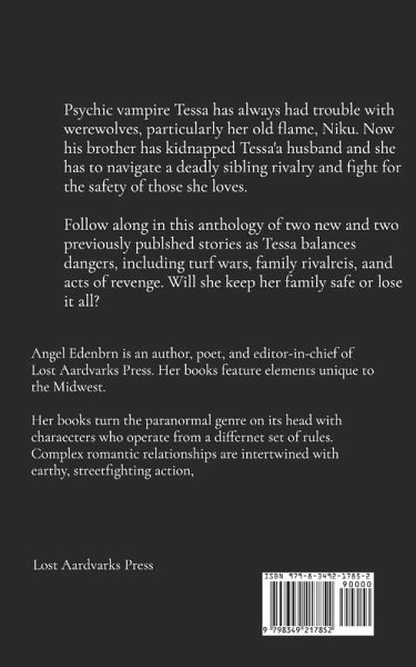 Werewolves always meant trouble for vampire psychic Tessa, and Niku was the worst. His brother kidnaps Tessa's husband in revenge, and now she has to navigate the deadly sibling rivalry while keeping herself and those she loves safe. This anthology of two published and a pair of unpublished stories follows Tessa as she navigates werewolf turf wars, sibling rivalries, acts of revenge, and other dangers. Will she be able to keep her family safe and survive, or will she lose it all?