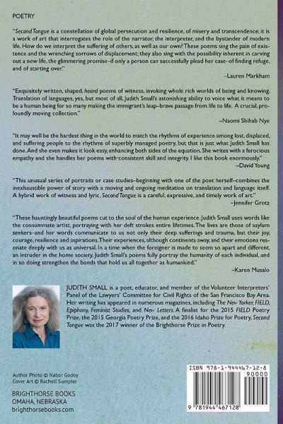 JUDITH SMALL is a poet, educator, and member of the Volunteer Interpreters' Panel of the Lawyers' Committee for Civil Rights of the San Francisco Bay Area. Her writing has appeared in numerous magazines, including The New Yorker, FIELD, Epiphany, Feminist Studies, and New Letters. She has published one previous book, From the Island (Black Oyster), a mixed-genre memoir. Her prior awards include the CCLM Fels Award and two Pushcart Prize nominations. A finalist for the 2015 FIELD Poetry Prize, the 2015 Georgia Poetry Prize, and the 2016 Idaho Prize for Poetry, Second Tongue was the 2017 winner of the Brighthorse Prize in Poetry. Small is currently coordinating the after-school Peer Interpreters Program at Oakland's Castlemont High School, where bilingual students from immigrant families learn the fundamentals of interpreting as they support newcomer students and their families.