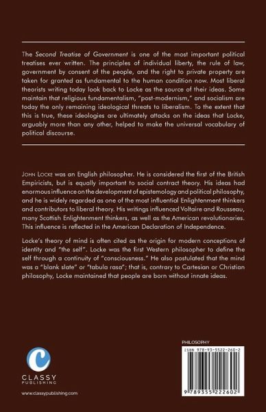 The Second Treatise of Government is one of the most important political treatises ever written. The principles of individual liberty, the rule of law, government by consent of the people, and the right to private property are taken for granted as fundamental to the human condition now. Most liberal theorists writing today look back to Locke as the source of their ideas. Some maintain that religious fundamentalism, "post-modernism," and socialism are today the only remaining ideological threats to liberalism. To the extent that this is true, these ideologies are ultimately attacks on the ideas that Locke, arguably more than any other, helped to make the universal vocabulary of political discourse.