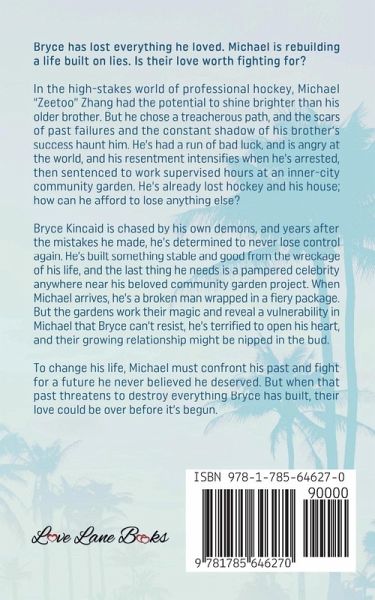 Bryce has lost everything he loved. Michael is rebuilding a life built on lies. Is their love worth fighting for? In the high-stakes world of professional hockey, Michael "Zeetoo" Zhang had the potential to shine brighter than his older brother, but he chose a treacherous path, and the scars of past failures and the constant shadow of his brother's success haunt him. He's had a run of bad luck, and is angry at the world, and his resentment intensifies when he's arrested, then sentenced to work supervised hours at an inner-city community garden. He's already lost hockey and his house; how can he afford to lose anything else? Bryce Kincaid is chased by his own demons, and years after the mistakes he made, he's determined to never lose control again. He's built something stable and good from the wreckage of his life, and the last thing he needs is a pampered celebrity anywhere near his beloved community garden project. When Michael arrives, he's a broken man wrapped in a fiery package, but the gardens work their magic and reveal a vulnerability in Michael that Bryce can't resist. He's terrified to open his heart, and their growing relationship might be nipped in the bud. To change his life, Michael must confront his past and fight for a future he's never believed he deserves. But when that past threatens to destroy everything Bryce has built, their love could be over before it's begun.