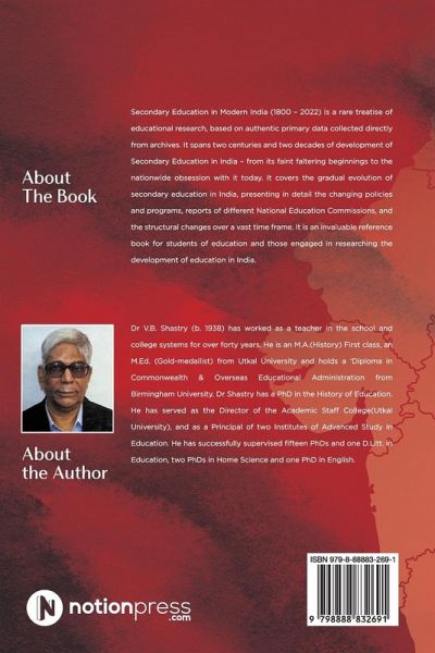Secondary Education in Modern India (1800 - 2022) is a rare treatise of educational research, based on authentic primary date collected directly from archives. It spans two centuries and two decades of development of Secondary Education in India - from its faint faltering beginnings to the nationwide obsession with it today. It covers the gradual evolution of secondary education in India, presenting in detail the changing policies and programs, reports of different National Education Commissions, and the structural changes over a vast time frame. It is an invaluable reference book for students of education and those engaged in researching the development of education in India.