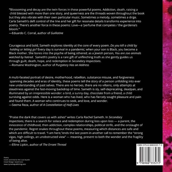 Secondary Inspections, Carla Rachel Sameth's first full-length poetry collection, explores the life of the mother with loss and nuance as the book's central figure simultaneously deals with a son's addiction and a mother's dementia and death. These twin trials are approached in the context of a flawed and celebrated humanity that is authentic, rewarding, and difficult. The seasons of grief also look backward on the experience of recurrent miscarriages, shining a light on the vulnerability and potential for loss inherent from the moment motherhood is first contemplated. The exposure of coming undone is very real here, as the poems say, unmoored, unspooled, unpacked, but alongside it, Sameth never turns away from the continued sense of becoming. Located in Los Angeles and beyond, the culture of place and finding home along with themes of Jewish ancestry, identity, race, and queerness are also touchstones. Secondary Inspections invites us to take a second look at what we thought we knew and shows us how things are not always what they seem-identity can be questioned, provoke danger, and leave us impacted by how others see us; the bedrock of a family can be forever shifting and we too shift along with it. Through powerful narrative and vivid imagery, Sameth's poetry travels, searches, stumbles, and ultimately, returns. Even amidst heart-staggering moments, she reveals a rich cultural life that is both within, and that is further made possible by deeply being in the places you love with the people you love.
