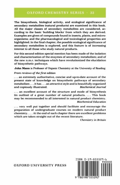The biosynthesis, biological activity, and ecological significance of secondary metabolites (natural products) are examined in this book. All the major classes of secondary metabolites are considered, according to the basic 'building blocks' from which they are derived. Examples are given of compounds found in insects, plants, and microorganisms; and the pharmacological and toxicological properties are highlighted. In the final chapter, the possible ecological significance of secondary metabolites is explored, and this feature is of increasing interest to all those who study natural products. For this second edition special mention has been made of the isolation and characterization of the enzymes of secondary metabolism; and of the new NMR techniques which have revolutionized the elucidation of biosynthetic pathways.