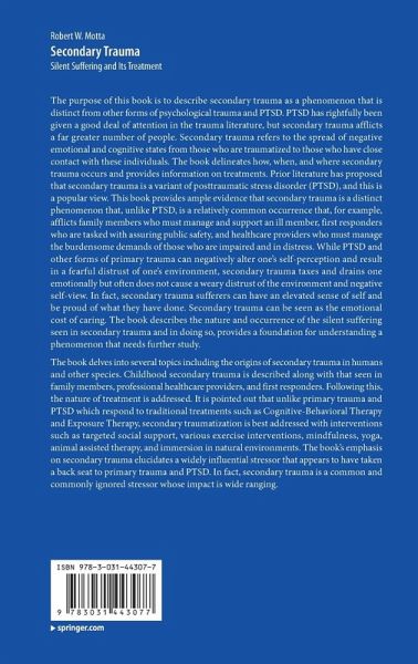 This book focuses on secondary trauma as distinct from other forms of psychological trauma and PTSD. While PTSD has garnered considerable attention in the literature, secondary trauma afflicts a far greater number of people. Secondary trauma refers to the spread of negative emotional and cognitive states from those who are traumatized to those who have close contact with these individuals. While PTSD and other forms of primary trauma can negatively alter one's self-perception and result in a fearful distrust of one's environment, secondary trauma taxes and drains one emotionally but often does not cause a weary distrust of the environment and negative self-view. The book delineates how, when, and where secondary trauma occurs and provides the latest information on treatments. it is noted that unlike primary trauma and PTSD which respond to traditional treatments such as cognitive-behavioral therapy and exposure therapy, secondary traumatization is best addressed with interventions such as targeted social support, various exercise interventions, mindfulness, yoga, animal assisted therapy, and immersion in natural environments. Secondary trauma is a common and commonly ignored stressor whose impact is wide ranging. This volume accessibly brings this problem to the fore and is a resource for all of those who deal with "silent sufferers" and paves the way for further, necessary study.
