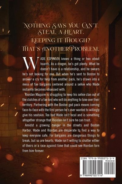Nothing says you can't steal a heart. Keeping it though? That's another problem. Wade Espinoza knows a thing or two about hoards. As a dragon, he's got plenty. What he doesn't have is a relationship, and he swears he's not looking for one. But when he's sent to Boston to answer a cry for help from another pack, he's drawn into a mess of fae bargains centered around a selkie who Wade instantly becomes obsessed with. Riordan Maguire is struggling to keep his selkie clan out of the clutches of a fae lord who will do anything to take over their territory. Partnering with the Boston god pack means coming face-to-face with the first person he's ever wanted to willingly give his sealskin. Too bad Wade isn't local and is something altogether strange that Riordan isn't sure he can trust. Amidst a growing danger in the streets and Boston Harbor, Wade and Riordan are desperate to find a way to keep everyone safe. For bargains are dangerous things to break, but so are hearts. Wade isn't willing to shatter either of theirs in a race against time that could see Riordan torn from him forever.