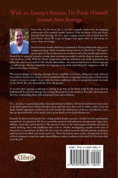 From First, Do No Harm, Dr. L. Jan Eira catapults readers into the gripping continuance of his medical murder mystery. With the release of his new book, Seconds from Revenge, he once again engages readers with medical hero Dr. Jack Norris, whose life is put in danger once again when an old enemy returns- bent on revenge. Several heinous murders had been committed at Newton Memorial using an investigational drug, which eventually became known as 'Rat Poison.' This experimental agent for heart failure patients was discovered to have deadly repercussions. Blinded by its potential lucrative rewards, three terrorists proceeded to test the drug on innocent men with much loss of life. With Dr. Norris' cooperation with the authorities, one of the executioners was killed, the other incarcerated for life, but the third villain - the mastermind known as Simon Lagrange - is still at large. Having escaped the law, Lagrange is now back and looking for vengeance-with Dr. Norris as his object of enmity. The mystery plunges as Lagrange sabotages Norris' credibility as a doctor, taking away many innocent lives without remorse. Co-workers of Norris helplessly fall prey to Lagrange's sinister plan; nobody can be trusted, everyone is a suspect. Soon, reality becomes a nightmare when an unexpected assault was made on Dr. Norris' life, nine-thousand feet above the ground. It was clear that Lagrange would stop at nothing to get him. Is Dr. Norris ready for the worst when he fi nds himself Seconds from Revenge? An arresting denouement awaits readers as Eira takes them deep into the story, confounding them with unexpected twists and revelations.