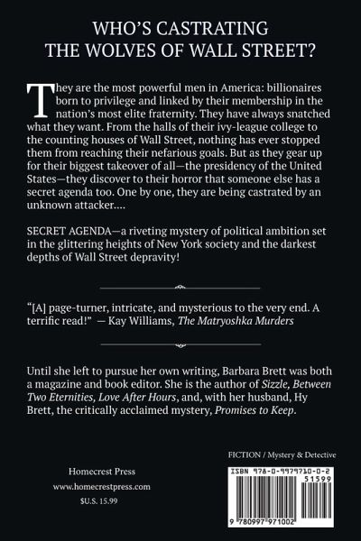 WINNER! Silver Medal! Best Mystery Fiction. 2018 Global Ebook Awards FINALIST! 2019 National Indie Excellence Awards They are the most powerful men in America: billionaires born to privilege and linked by their membership in the nation's most elite fraternity. They have always snatched what they want. From the halls of their ivy-league college to the counting houses of Wall Street, nothing has ever stopped them from reaching their nefarious goals. But as they gear up for their biggest takeover of all—the presidency of the United States—they discover to their horror that someone else has a secret agenda too. One by one, they are being castrated by an unknown attacker.... SECRET AGENDA—a riveting mystery of political ambition set in the glittering heights of New York society and the darkest depths of Wall Street depravity! "[A] page-turner, intricate, and mysterious to the very end. A terrific read!" Kay Williams, The Matryoshka Murders