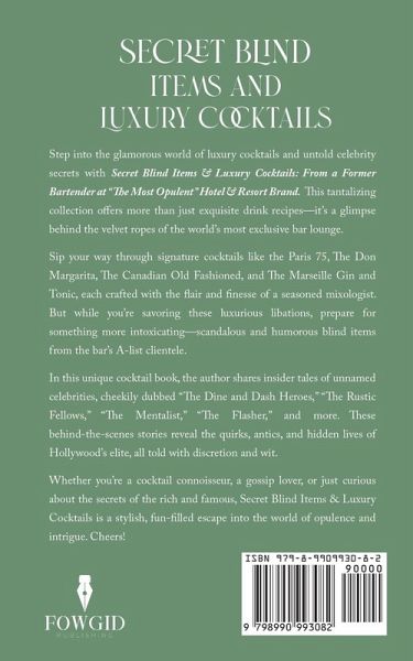 "This hip-hop mogul and label head had a swagger that turned heads and instilled fear in hearts everywhere he went. He would saunter into "The Most Opulent" lounge to meet his artists, and other colorful characters while running up large tabs on his table. He demanded only the finest - top-shelf liquors, imported cigars, and exclusive VIP treatment. His favorite thing to do was to vanish from the lounge without paying because he knew that the staff was not going to force the issue with him..." Step into the glamorous world of luxury cocktails and untold celebrity secrets with Secret Blind Items & Luxury Cocktails: From a Former Bartender at "The Most Opulent" Hotel & Resort Brand. This tantalizing collection offers more than just exquisite drink recipes-it's a glimpse behind the velvet ropes of the world's most exclusive bar lounge. Sip your way through signature cocktails like the Paris 75, The Don Margarita, The Canadian Old Fashioned, and The Marseille Gin and Tonic, each crafted with the flair and finesse of a seasoned mixologist. But while you're savoring these luxurious libations, prepare for something more intoxicating-scandalous and humorous blind items from the bar's A-list clientele. In this unique cocktail book, the author shares insider tales of unnamed celebrities, cheekily dubbed "The Dine and Dash Heroes," "The Rustic Fellows," "The Mentalist," "The Flasher," and more. These behind-the-scenes stories reveal the quirks, antics, and hidden lives of Hollywood's elite, all told with discretion and wit. Whether you're a cocktail connoisseur, a gossip lover, or just curious about the secrets of the rich and famous, Secret Blind Items & Luxury Cocktails is a stylish, fun-filled escape into the world of opulence and intrigue. Cheers!