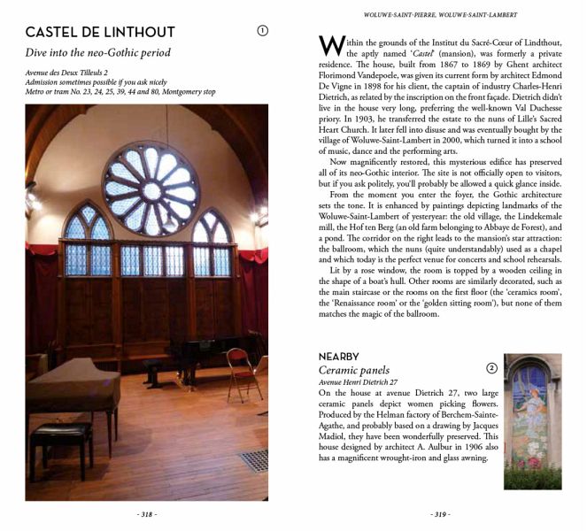 A 'love hotel' where one can say a prayer, a stretch of theSenne reconstituted in Saint-Géry, a farm in the centre ofthe city, a Freemasonic reading of the Brussels Park, theamazing physiognomical fountain of Magritte, the placewhere the Tsar of Russia vomited at the park of Brussels in1717, the former rotunda of Panorama parking, a tributeto the soldier pigeon, from speleology to The NationalBasilica of the Sacred Heart, a panoramic swimming pool,a scandalous pavilion in the park Cinquantenaire, a hugevegetable garden in Uccle, a 19th century artist's studio inSchaerbeek, a campsite in the heart of the city, a gardenforgotten in the Forest ...For those who can observe, push the doors and exit beatentracks, Brussels is full of curiosities and surprising detailsthat will amaze its inhabitants as well as its visitors whothought they knew it well.