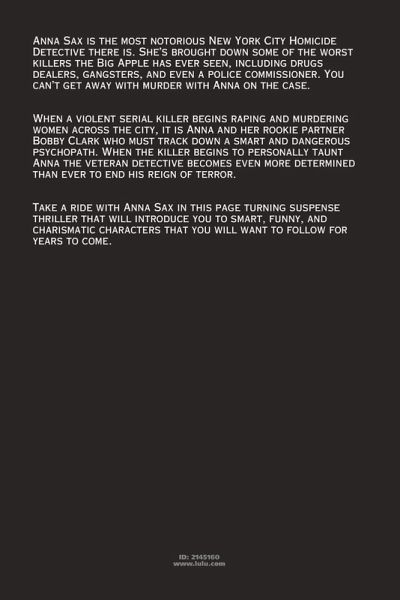 Anna Sax is the most notorious New York City Homicide Detective there is. She's brought down some of the worst killers the Big Apple has ever seen, including drugs dealers, gangsters, and even a police commissioner. You can't get away with murder with Anna on the case. When a violent serial killer begins raping and murdering women across the city, it is Anna and her rookie partner Bobby Clark who must track down a smart and dangerous psychopath. When the killer begins to personally taunt Anna the veteran detective becomes even more determined than ever to end his reign of terror. Take a ride with Anna Sax in this page turning suspense thriller that will introduce you to smart, funny, and charismatic characters that you will want to follow for years to come.