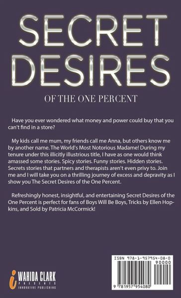 Have you ever wondered what money and power could buy that you can't find in a store? My kids call me mum, my friends call me Anna, but others know me by another name. The World's Most Notorious Madame! During my tenure under this illicitly illustrious title, I have as one would think amassed some stories. Spicy stories. Funny stories. Hidden stories. Secrets stories that partners and therapists aren't even privy to. Join me and I will take you on a thrilling journey of excess and depravity as I show you The Secret Desires of the One Percent. Refreshingly honest, insightful, and entertaining Secret Desires of the One Percent is perfect for fans of Boys Will Be Boys, Tricks by Ellen Hopkins, and Sold by Patricia McCormick!