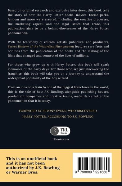 Based on original research and exclusive interviews, this book tells the story of how the Harry Potter books, movies, theme parks, fandom and more were created. Including the creative processes, the marketing aspect, and the legal issues that arose, this publication aims to be a behind-the-scenes of the Harry Potter phenomenon. With the testimony of editors, artists, publicists, and producers, Secret History of the Wizarding Phenomenon features rare facts and oddities from the publication of the books and the making of the films that changed and connected the lives of millions. For those who grew up with Harry Potter, this book will spark memories of the early days. For those who are just discovering the franchise, this book will take you on a journey to understand the widespread popularity of the boy wizard. From an idea on a train to one of the biggest franchises in the world, this is the tale of how J.K. Rowling, alongside publishing houses, production companies and creative teams, made Harry Potter the phenomenon that it is today. Foreword by Bryony Evens, who discovered Harry Potter according to J.K. Rowling. Note: This is an unnoficial book and it has not been authorized by J.K. Rowling or Warner Bros.