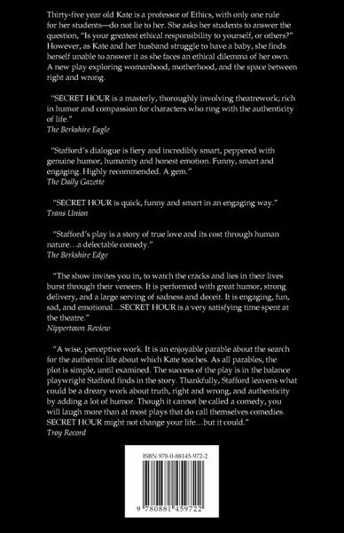 Thirty-five year old Kate is a professor of Ethics, with only one rule for her students-do not lie to her. She asks her students to answer the question, "Is your greatest ethical responsibility to yourself, or others?" However, as Kate and her husband struggle to have a baby, she finds herself unable to answer it as she faces an ethical dilemma of her own. A new play exploring womanhood, motherhood, and the space between right and wrong. "SECRET HOUR is a masterly, thoroughly involving theatrework; rich in humor and compassion for characters who ring with the authenticity of life." The Berkshire Eagle "Stafford's dialogue is fiery and incredibly smart, peppered with genuine humor, humanity and honest emotion. Funny, smart and engaging. Highly recommended. A gem." The Daily Gazette "SECRET HOUR is quick, funny and smart in an engaging way." Trans Union "Stafford's play is a story of true love and its cost through human nature...a delectable comedy." The Berkshire Edge "The show invites you in, to watch the cracks and lies in their lives burst through their veneers. It is performed with great humor, strong delivery, and a large serving of sadness and deceit. It is engaging, fun, sad, and emotional...SECRET HOUR is a very satisfying time spent at the theatre." Nippertown Review "A wise, perceptive work. It is an enjoyable parable about the search for the authentic life about which Kate teaches. As all parables, the plot is simple, until examined. The success of the play is in the balance playwright Stafford finds in the story. Thankfully, Stafford leavens what could be a dreary work about truth, right and wrong, and authenticity by adding a lot of humor. Though it cannot be called a comedy, you will laugh more than at most plays that do call themselves comedies. SECRET HOUR might not change your life...but it could." Troy Record