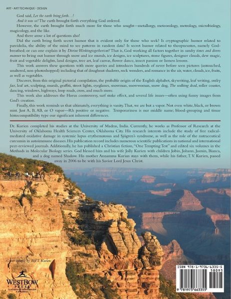God said, Let the earth bring forth. . ! And it was so! The earth brought forth everything God ordered. However, the earth brought forth much more for those who sought-metallurgy, meteorology, metrology, microbiology, magicology, and the like. And there arose a lot of questions also! Did the earth bring forth secret humor that is evident only for those who seek? Is cryptographic humor related to pareidolia, the ability of the mind to see patterns in random data? Is secret humor related to theopneustos, namely God-breathed; or can one explain it by Divine Workingtogetherism? That is, God working all factors together in sundry times and divers manner to bring out humor through snow and ice murals, ice designs, ice sculptures, stone figures, designer clouds, dew magic, fruit and vegetable delights, land designs, tree art, leaf canvas, flower dance, insect passion or lioness lessons. This work answers these questions with more queries and introduces hundreds of never before seen pictures (untouched, unaltered, non-photoshopped) including that of doughnut shadows, rock wonders, and romance in the air, water, clouds, ice, fruits, as well as vegetables. Discover, from this original pictorial compilation, the probable origin of the English alphabet, skywriting, leaf writing, smiley face, leaf art, sculpting, murals, graffiti, street lights, eyeglasses, snowman, snowwoman, snow dog, The walking dead, roller coaster, dancing, windows, highways, loop roads, cross, and much more. This work also addresses the Horus controversy, surf stoke effect, and several life issues-often using funny images from God's creation. Finally, this work reminds us that ultimately, everything is vanity. That, we are but a vapor. Not even white, black, or brown mist. Just A, B, AB, or O vapor-Rh positive or negative. Temporariness is our middle name; blood-grouping and tissue histocompatibility type our significant inherent differences.