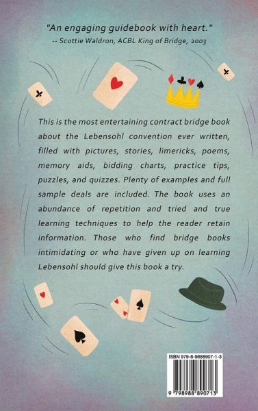 This is an entertaining contract bridge book about the Lebensohl convention, filled with pictures, stories, limericks, poems, memory aids, bidding charts, practice tips, puzzles, and quizzes. Plenty of examples and full sample deals are included. This book uses an abundance of repetition and tried and true learning techniques to help the reader retain information.The Foreword is written by Scottie Waldron, ACBL King of Bridge, 2003. This book was named a top-rated runner-up in the American Bridge Teachers' Association (ABTA) 2024 Book of the Year awards for the Advanced-intermediate category. Who should read this book? This book is for:Savvy bridge players who want to learn Lebensohl in an enjoyable way. Anyone who needs a Lebensohl refresher course. Cool bridge teachers who want to use an informal text that takes a light-hearted, fun approach to Lebensohl. Bridge players who take secret pleasure in doubling the opponents, when appropriate, and collecting big penalties. Busy bridge players who are tired of combing the Internet and finding inconsistent and sometimes inaccurate information on the topic. People who appreciate lots of examples followed by puzzles and quizzes to check progress. People who enjoy bridge tales from the trenches and learning by hearing about "Lebensohl hands gone wrong" and what not to do. People who like information summarized in concise bidding charts. Creative people who enjoy bidding rules summarized in the form of a poem. People who love to collect "rules of thumb" about playing bridge. People who appreciate clever illustrations. People who are looking for an enjoyable book that looks like someone put a lot of time, effort, and love into creating it. People who love learning about bridge but need a book that doesn't read like a refrigerator manual. People of all ages who want to learn Lebensohl. (This book may even be appropriate for gifted kids with good reading skills.) Those who find bridge books intimidating or who have given up on learning Lebensohl. What will you learn? You will learn:The interesting backstory behind the Lebensohl convention. What Lebensohl is all about and situations where it applies. What you give up when you play Lebensohl and what you gain. Why Lebensohl is superior to the "stolen bids" system. Why experts like Lebensohl. What you should do if you know your side has the lion's share (23+ points). Suggested rules for playing Lebensohl when the opponents interfere over your side's 1NT. How to make effective use of penalty doubles when playing Lebensohl. Counterdefenses to NT defenses. Dealing with higher level interference over 1NT. Dealing with artificial interference over 1NT (e.g., when opps have a two-suited holding where both suits are known, when opps have a two-suited holding where only one suit is known, when opps have a two-suited holding where both suits are unknown, when opps have a one-suited holding that is either known or unknown, when opps have an either/or holding of some variety). How to handle delayed Lebensohl situations (when the opps don't interfere immediately). How to alert Lebensohl bids. How to use Lebensohl when the opps open a weak two-bid and partner doubles and when it's okay to pass partner's double (and when it's not). How to use Lebensohl after partner reverses. When it's okay to break the Lebensohl relay. Whether Lebensohl is a relay bid or a puppet bid (and why it doesn't matter). An introduction to basic Transfer Lebensohl. Some of the most common mistakes when playing Lebensohl and how to avoid them. Some differences in the way that people play Lebensohl. And much more.