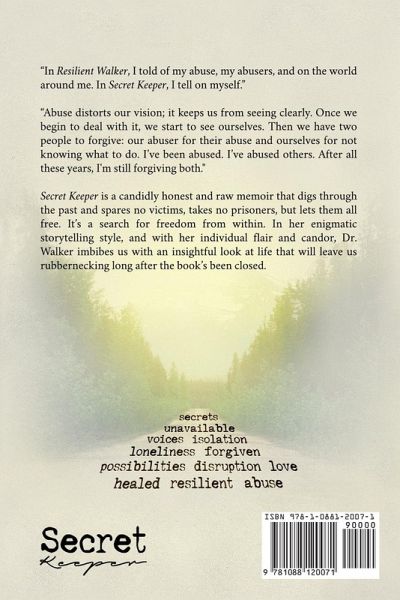 "In Resilient Walker, I told of my abuse, my abusers, and on the world around me. In Secret Keeper, I tell on myself." "Abuse distorts our vision; it keeps us from seeing clearly. Once we begin to deal with it, we start to see ourselves. Then we have two people to forgive: our abuser for their abuse and ourselves for not knowing what to do. I've been abused. I've abused others. After all these years, I'm still forgiving both." Secret Keeper is a candidly honest and raw memoir that digs through the past and spares no victims, takes no prisoners, but lets them all free. It's a search for freedom from within. In her enigmatic storytelling style, and with her individual flair and candor, Dr. Walker imbibes us with an insightful look at life that will leave us rubbernecking long after the book's been closed.