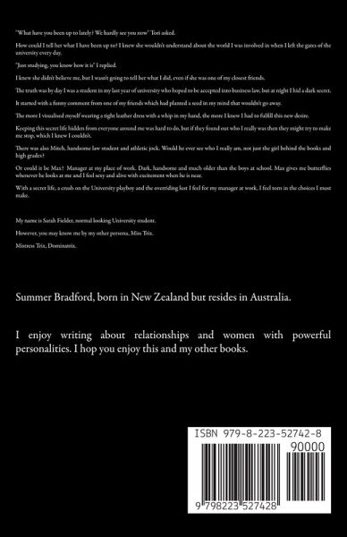"What have you been up to lately? We hardly see you now" Tori asked. How could I tell her what I have been up to? I knew she wouldn't understand about the world I was involved in when I left the gates of the university every day. "Just studying, you know how it is" I replied. I knew she didn't believe me, but I wasn't going to tell her what I did, even if she was one of my closest friends. The truth was by day I was a student in my last year of university who hoped to be accepted into business law, but at night I hid a dark secret. It started with a funny comment from one of my friends which had planted a seed in my mind that wouldn't go away. The more I visualised myself wearing a tight leather dress with a whip in my hand, the more I knew I had to fulfill this new desire. Keeping this secret life hidden from everyone around me was hard to do, but if they found out who I really was then they might try to make me stop, which I knew I couldn't. There was also Mitch, handsome law student and athletic jock. Would he ever see who I really am, not just the girl behind the books and high grades? Or could it be Max? Manager at my place of work. Dark, handsome and much older than the boys at school. Max gives me butterflies whenever he looks at me and I feel sexy and alive with excitement when he is near. With a secret life, a crush on the University playboy and the overriding lust I feel for my manager at work, I feel torn in the choices I must make. My name is Sarah Fielder, normal looking University student. However, you may know me by my other persona, Miss Trix. Mistress Trix, Dominatrix.