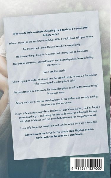 Who meets their soulmate shopping for bagels in a supermarket bakery aisle? Before I moved to the small town of Silver Hills, I would have told you no one. But the second I meet Henley Ward, I'm swept away. He is everything I look for in a man: tall, strong and so handsome. Our instant attraction, spirited banter, and heated glances leave a lasting impression... Until I see him again. Like a raging tornado, he storms into the school ready to take on the teacher who has crushed his daughter's spirit. The dedication this man has to his three daughters could be the sexiest thing I have ever seen. Before we know it, we are stealing kisses in his kitchen and secretly getting together any chance we can. I know I should stay away from Henley so I don't lose my job, and his focus is on raising the girls and being the best wide receiver in football, but our attraction is intense and the draw between us is too tempting to resist. I can only hope our secret love will survive when our truth is revealed. Secret Love is book two in the Single Dad Playbook series. Each book can be read as a standalone.