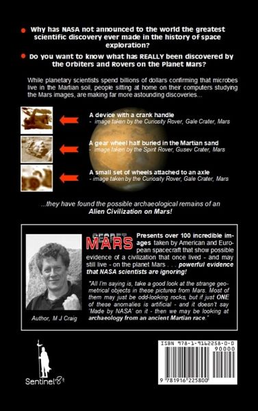 SECRET MARS: THE ALIEN CONNECTION – A New, Revised & Expanded Edition (2017) that includes controversial and astounding images from NASA's Curiosity Rover... WHY HAS NASA not announced to the world the greatest scientific discovery ever made in the history of space exploration? DO YOU WANT to know what has REALLY been discovered by the Orbiters and Rovers on the Planet Mars? While scientists spend billions of dollars confirming that microbes live in the Martian soil, people sitting at home on their computers studying the Mars images, are making far more astounding discoveries...they have found the possible archaeological remains of an extraterrestrial civilization! Hard to believe? Well, this challenging book invites you to take a look at the astounding pictures yourself and make up your own mind... SECRET MARS presents over 100 incredible images taken by American and European spacecraft that reveal possible evidence of a civilization that once lived and may still live, on the Planet Mars...powerful evidence that scientists are ignoring! SECRET MARS also reveals the shocking reason why NASA is forbidden to tell the world about what has been found... "All I'm saying, is take a look at the strange geometrical objects in these pictures from Mars. Most of them may just be odd-looking rocks, but if just ONE of these is artificial - and it doesn't have 'Made by NASA' stamped on it -, then we may be looking at archaeology from an ancient Martian race" - M J Craig, author of Secret Mars.