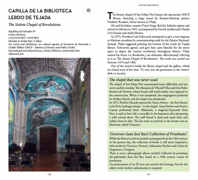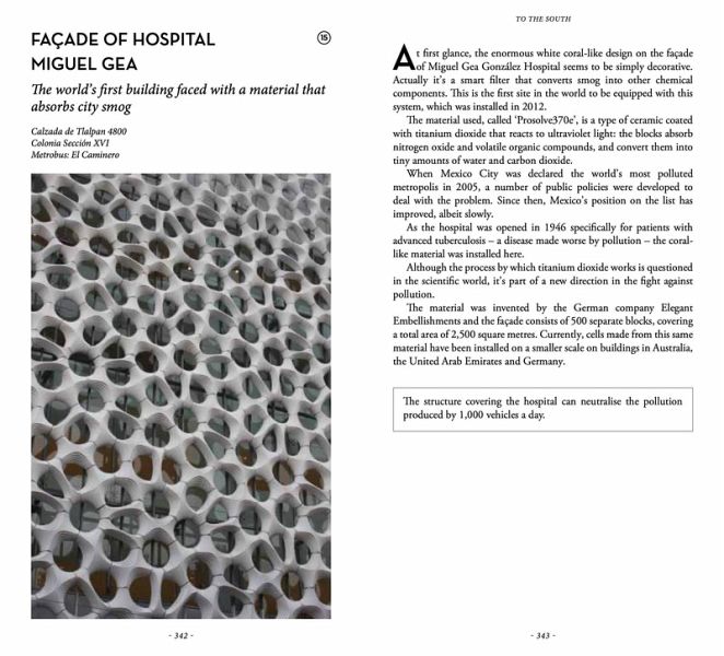 The forgotten café where Fidel Castro and Che Guevara used to meet, a tribute to the city's ghosts, a mammoth in the metro, a cave transformed into a shrine, an underground parking lot with mosaics dating from 1930, a Baroque altarpiece made from papier mâché, a village based on the principles of Thomas More's Utopia, secret masterpieces of colonial art in rooms only open around two hours a week, the largest roof garden in Latin America, the photo on which the Oscar statuette is modelled, the first building in the world faced with a material that can trap urban smog, a road surface designed for praying as you walk ... Far from the crowds and the usual clichés, Mexico City is filled with hidden treasures revealed only to the residents and visitors who leave the beaten path. An indispensable guide for those who thought they knew the city well or who would like to discover its many other facets.