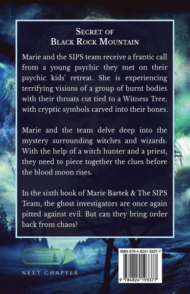 Marie and the SIPS team receive a frantic call from a young psychic they met on their psychic kids' retreat. She is experiencing terrifying visions of a group of burnt bodies with their throats cut tied to a Witness Tree, with cryptic symbols carved into their bones. Marie and the team delve deep into the mystery surrounding witches and wizards. With the help of a witch hunter and a priest, they need to piece together the clues before the blood moon rises. In the sixth book of Marie Bartek & The SIPS Team, the ghost investigators are once again pitted against evil. But can they bring order back from chaos?