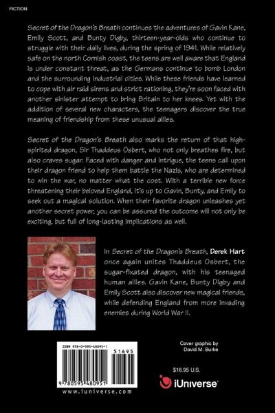 Secret of the Dragon's Breath continues the adventures of Gavin Kane, Emily Scott, and Bunty Digby, thirteen-year-olds who continue to struggle with their daily lives, during the spring of 1941. While relatively safe on the north Cornish coast, the teens are well aware that England is under constant threat, as the Germans continue to bomb London and the surrounding industrial cities. While these friends have learned to cope with air raid sirens and strict rationing, they're soon faced with another sinister attempt to bring Britain to her knees. Yet with the addition of several new characters, the teenagers discover the true meaning of friendship from these unusual allies. Secret of the Dragon's Breath also marks the return of that high-spirited dragon, Sir Thaddeus Osbert, who not only breathes fire, but also craves sugar. Faced with danger and intrigue, the teens call upon their dragon friend to help them battle the Nazis, who are determined to win the war, no matter what the cost. With a terrible new force threatening their beloved England, it's up to Gavin, Bunty, and Emily to seek out a magical solution. When their favorite dragon unleashes yet another secret power, you can be assured the outcome will not only be exciting, but full of long-lasting implications as well.