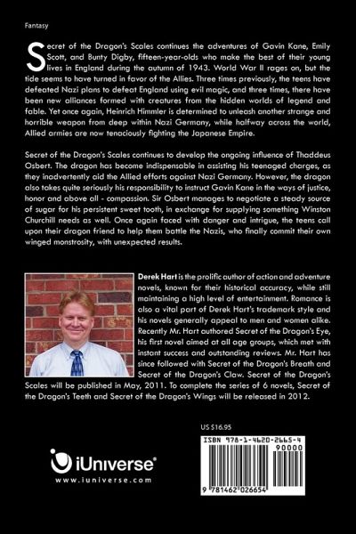 Secret of the Dragon's Scales continues the adventures of Gavin Kane, Emily Scott, and Bunty Digby, fifteen-year-olds who make the best of their young lives in England during the autumn of 1943. World War II rages on, but the tide seems to have turned in favor of the Allies. Three times previously, the teens have defeated Nazi plans to defeat England using evil magic, and three times, there have been new alliances formed with creatures from the hidden worlds of legend and fable. Yet once again, Heinrich Himmler is determined to unleash another strange and horrible weapon from deep within Nazi Germany, while halfway across the world, Allied armies are now tenaciously fighting the Japanese Empire. Secret of the Dragon's Scales continues to develop the ongoing influence of Thaddeus Osbert. The dragon has become indispensable in assisting his teenaged charges, as they inadvertently aid the Allied efforts against Nazi Germany. However, the dragon also takes quite seriously his responsibility to instruct Gavin Kane in the ways of justice, honor and above all - compassion. Sir Osbert manages to negotiate a steady source of sugar for his persistent sweet tooth, in exchange for supplying something Winston Churchill needs as well. Once again faced with danger and intrigue, the teens call upon their dragon friend to help them battle the Nazis, who finally commit their own winged monstrosity, with unexpected results.