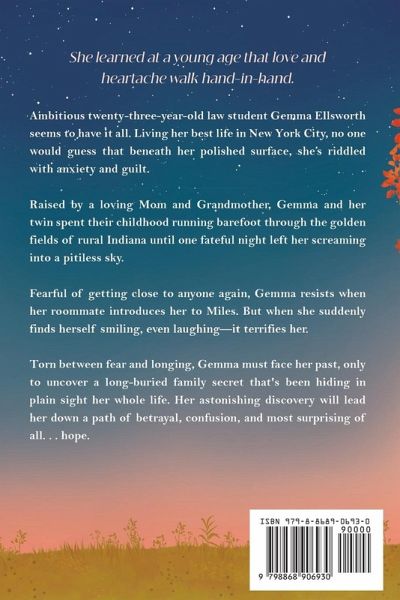 She learned at a young age that love and heartache walk hand-in-hand. Ambitious twenty-three-year-old law student Gemma Ellsworth seems to have it all. Living her best life in New York City, no one would guess that beneath her polished surface, she's riddled with anxiety and guilt. Raised by a loving Mom and Grandmother, Gemma and her twin spent their childhood running barefoot through the golden fields of rural Indiana until one fateful night left her screaming into a pitiless sky. Fearful of getting close to anyone again, Gemma resists when her roommate introduces her to Miles. But when she suddenly finds herself smiling, even laughing-it terrifies her. Torn between fear and longing, Gemma must face her past, only to uncover a long-buried family secret that's been hiding in plain sight her whole life. Her astonishing discovery will lead her down a path of betrayal, confusion, and most surprising of all. . . hope.
