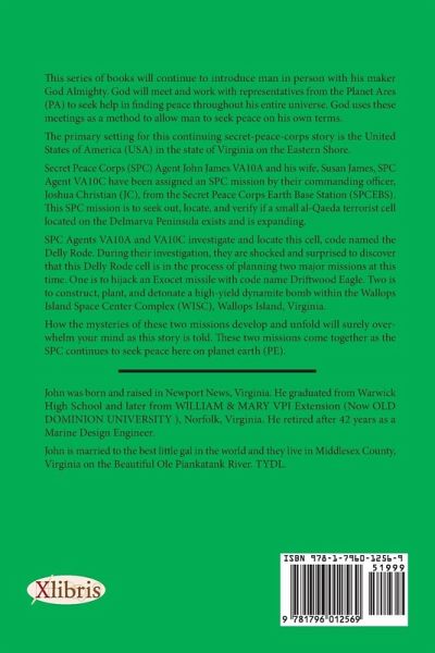 This series of books will continue to introduce man in person with his maker God Almighty. God will meet and work with representatives from the Planet Ares (PA) to seek help in finding peace throughout his entire universe. God uses these meetings as a method to allow man to seek peace on his own terms. The primary setting for this continuing secret-peace-corps story is the United States of America (USA) in the state of Virginia on the Eastern Shore. Secret Peace Corps (SPC) Agent John James VA10A and his wife, Susan James, SPC Agent VA10C have been assigned an SPC mission by their commanding officer, Joshua Christian (JC), from the Secret Peace Corps Earth Base Station (SPCEBS). This SPC mission is to seek out, locate, and verify if a small al-Qaeda terrorist cell located on the Delmarva Peninsula exists and is expanding. SPC Agents VA10A and VA10C investigate and locate this cell, code named the Delly Rode. During their investigation, they are shocked and surprised to discover that this Delly Rode cell is in the process of planning two major missions at this time. One is to hijack an Exocet missile with code name Driftwood Eagle. Two is to construct, plant, and detonate a high-yield dynamite bomb within the Wallops Island Space Center Complex (WISC), Wallops Island, Virginia. How the mysteries of these two missions develop and unfold will surely overwhelm your mind as this story is told. These two missions come together as the SPC continues to seek peace here on planet earth (PE).
