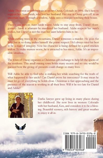 Addie Thornton arrives by train in snowy Ouray, Colorado in 1896. She's here to support her Aunt Sarah, who lost her husband. Her stay in Ouray gets off to an uncertain start. Through a window, Addie sees a stranger watching their house. There's one person Aunt Sarah warns Addie to stay away from. Daniel Montgomery. Sarah is adamant he murdered her husband. Addie respects her aunt's wishes, but Daniel is not the man her aunt believes him to be. While cutting trees in the mountains, Daniel witnesses a murder. He goes for help, but in so doing makes himself the prime suspect. He's always tried his best to be a man of integrity. Now his character is being defined by a grief-stricken widow. To make matters worse, he is attracted to her niece, Addie. It's an impossible situation. The town of Ouray organizes a Christmas gift exchange to help lift the spirits of the residents. This small mining town holds many secrets and no one would've guessed how the giving of presents could change so many lives. Will Addie be able to find who is stalking her while searching for the truth of what happened to her uncle? Can Daniel prove his innocence? It may mean he must let go of everything he holds close. Christmas is fast approaching and the presence of the season is working in all their lives. Will it be too late for Daniel and Addie?