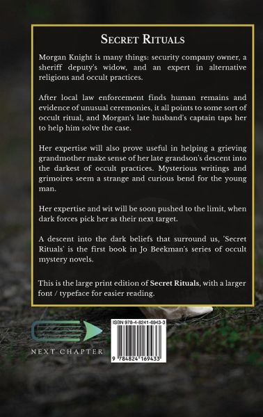 Morgan Knight is many things: security company owner, a sheriff deputy's widow, and an expert in alternative religions and occult practices. After local law enforcement finds human remains and evidence of unusual ceremonies, it all points to some sort of occult ritual, and Morgan's late husband's captain taps her to help him solve the case. Her expertise will also prove useful in helping a grieving grandmother make sense of her late grandson's descent into the darkest of occult practices. Mysterious writings and grimoires seem a strange and curious bend for the young man. Her expertise and wit will be soon pushed to the limit, when dark forces pick her as their next target. A descent into the dark beliefs that surround us, 'Secret Rituals' is the first book in Jo Beekman's series of occult mystery novels. This is the large print edition of Secret Rituals, with a larger font / typeface for easier reading.