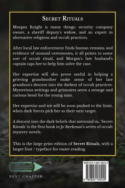 Morgan Knight is many things: security company owner, a sheriff deputy's widow, and an expert in alternative religions and occult practices. After local law enforcement finds human remains and evidence of unusual ceremonies, it all points to some sort of occult ritual, and Morgan's late husband's captain taps her to help him solve the case. Her expertise will also prove useful in helping a grieving grandmother make sense of her late grandson's descent into the darkest of occult practices. Mysterious writings and grimoires seem a strange and curious bend for the young man. Her expertise and wit will be soon pushed to the limit, when dark forces pick her as their next target. A descent into the dark beliefs that surround us, 'Secret Rituals' is the first book in Jo Beekman's series of occult mystery novels. This is the large print edition of Secret Rituals, with a larger font / typeface for easier reading.
