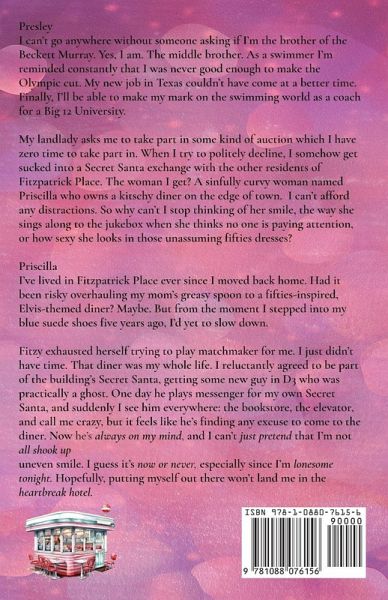Presley I can't go anywhere without someone asking if I'm the brother of the Beckett Murray. Yes, I am. The middle brother. As a swimmer I'm reminded constantly that I was never good enough to make the Olympic cut. My new job in Texas couldn't have come at a better time. Finally, I'll be able to make my mark on the swimming world as a coach for a Big 12 University. My landlady asks me to take part in some kind of auction which I have zero time to take part in. When I try to politely decline, I somehow get sucked into a Secret Santa exchange with the other residents of Fitzpatrick Place. The woman I get? A sinfully curvy woman named Priscilla who owns a kitschy diner on the edge of town. I'll play along for the entire week of gift-giving and merriment, but I need to show the university that while I'm not my brother, I'm equally skilled in the pool. I can't afford any distractions. So why can't I stop thinking of her smile, the way she sings along to the jukebox when she thinks no one is paying attention, or how sexy she looks in those unassuming fifties dresses? Priscilla I've lived in Fitzpatrick Place ever since I moved back home. Had it been risky overhauling my mom's greasy spoon to a fifties-inspired, Elvis-themed diner? Maybe. But from the moment I stepped into my blue suede shoes five years ago, I'd yet to slow down. Fitzy exhausted herself trying to play matchmaker for me. I just didn't have time. That diner was my whole life. I reluctantly agreed to be part of the building's Secret Santa, getting some new guy in D3 who was practically a ghost. He would get some cute gifts from me but I had no time to introduce new people to the neighborhood or entertain total strangers. I'd do my best at holiday cheer-but it would be the bare minimum. One day he plays messenger for my own Secret Santa, and suddenly I see him everywhere: the bookstore, the elevator, and call me crazy, but it feels like he's finding any excuse to come to the diner. Now he's always on my mind, and I can't just pretend that I'm not all shook up every time he looks at me with those deep blue eyes and uneven smile. I guess it's now or never, especially since I'm lonesome tonight. Hopefully, putting myself out there won't land me in the heartbreak hotel. Secret Santa is a curvy heroine, matchmaker, and holiday romance that is guaranteed safe with no cheating and no cliffhangers. Why not spend some time at Fitzpatrick Place?