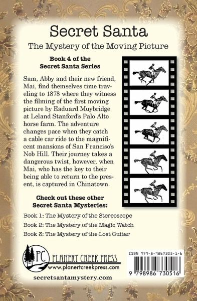 Sam, Abby and their new friend, Mai, find themselves time traveling to 1878 where they witness the filming of the first moving picture by Eaduard Muybridge at Leland Stanford's Palo Alto horse farm. The adventure changes pace when they catch a cable car ride to the magnificent mansions of San Franciso's Nob Hill. Their journey takes a dangerous twist, however, when Mai, who has the key to their being able to return to the present, is captured in Chinatown. This is book 4 of the Secret Santa middle-grade mystery series.