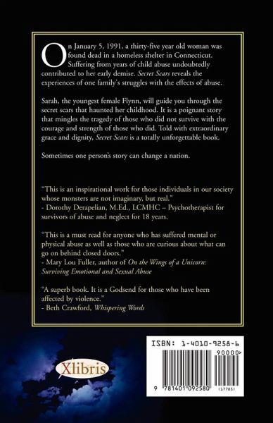 On January 5, 1991, a thirty-five year old woman was found dead in a homeless shelter. Suffering from years of child abuse undoubtedly contributed to her early demise. Secret Scars reveals the experiences of one family¿s struggles with the devastating effects of abuse. Sarah, the youngest female Flynn, will guide you through the secret scars that haunted her childhood. It is a poignant story that mingles the tragedy of those who did not survive with the courage and strength of those who did.Told with extraordinary strength and dignity, Secret Scars is a totally unfogettable book. Sometimes one person¿s story can change a nation.