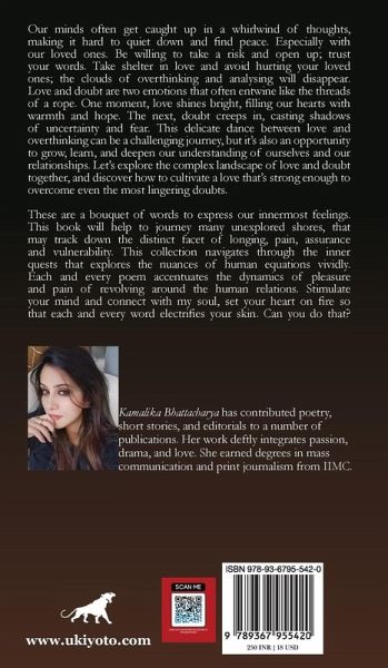 Our minds often get caught up in a whirlwind of thoughts, making it hard to quiet down and find peace. Especially with our loved ones. Be willing to take a risk and open up; trust your words. Take shelter in love and avoid hurting your loved ones; the clouds of overthinking and analysing will disappear. Love and doubt are two emotions that often entwine like the threads of a rope. One moment, love shines bright, filling our hearts with warmth and hope. The next, doubt creeps in, casting shadows of uncertainty and fear. This delicate dance between love and overthinking can be a challenging journey, but it's also an opportunity to grow, learn, and deepen our understanding of ourselves and our relationships. Let's explore the complex landscape of love and doubt together, and discover how to cultivate a love that's strong enough to overcome even the most lingering doubts. These are a bouquet of words to express our innermost feelings. This book will help to journey many unexplored shores, that may track down the distinct facet of longing, pain, assurance and vulnerability. This collection navigates through the inner quests that explores the nuances of human equations vividly. Each and every poem accentuates the dynamics of pleasure and pain of revolving around the human relations. Stimulate your mind and connect with my soul, set your heart on fire so that each and every word electrifies your skin. Can you do that?