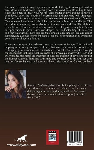 Our minds often get caught up in a whirlwind of thoughts, making it hard to quiet down and find peace. Especially with our loved ones. Be willing to take a risk and open up; trust your words. Take shelter in love and avoid hurting your loved ones; the clouds of overthinking and analysing will disappear. Love and doubt are two emotions that often entwine like the threads of a rope. One moment, love shines bright, filling our hearts with warmth and hope. The next, doubt creeps in, casting shadows of uncertainty and fear. This delicate dance between love and overthinking can be a challenging journey, but it's also an opportunity to grow, learn, and deepen our understanding of ourselves and our relationships. Let's explore the complex landscape of love and doubt together, and discover how to cultivate a love that's strong enough to overcome even the most lingering doubts. These are a bouquet of words to express our innermost feelings. This book will help to journey many unexplored shores, that may track down the distinct facet of longing, pain, assurance and vulnerability. This collection navigates through the inner quests that explores the nuances of human equations vividly. Each and every poem accentuates the dynamics of pleasure and pain of revolving around the human relations. Stimulate your mind and connect with my soul, set your heart on fire so that each and every word electrifies your skin. Can you do that?