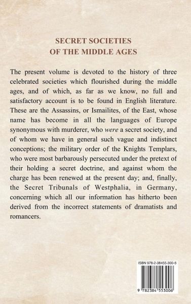 The present volume is devoted to the history of three celebrated societies which flourished during the middle ages, and of which, as far as we know, no full and satisfactory account is to be found in English literature. These are the Assassins, or Ismailites, of the East, whose name has become in all the languages of Europe synonymous with murderer, who were a secret society, and of whom we have in general such vague and indistinct conceptions; the military order of the Knights Templars, who were most barbarously persecuted under the pretext of their holding a secret doctrine, and against whom the charge has been renewed at the present day; and, finally, the Secret Tribunals of Westphalia, in Germany, concerning which all our information has hitherto been derived from the incorrect statements of dramatists and romancers.