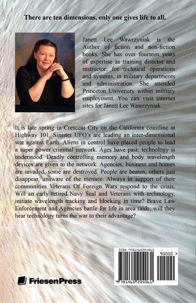 There are ten dimensions, only one gives life to all. It is late spring in Crescent City on the California coastline at Highway 101. Sinister UFO's are leading an inter-dimensional war against Earth. Aliens in control have placed people to lead a super power criminal network. Ages have past, technology is understood. Deadly controlling memory and body wavelength devices are given to the network. Agencies, business and homes are invaded, some are destroyed. People are beaten, others just disappear, unaware of the menace. Always in support of their communities Veterans Of Foreign Wars respond to the crisis. Will an early retired Navy Seal and Veterans with technology, initiate wavelength tracking and blocking in time? Brave Law Enforcement and Agencies battle for life in area raids; will they hear technology turns the war to their advantage?