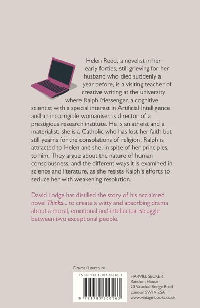 Helen Reed a novelist in her early forties still grieving for her husband who died suddenly a year before is a visiting teacher of creative writing at a university where Ralph Messenger a cognitive scientist with a special interest in Artificial Intelligence and an incorrigible womaniser is director of a prestigious research institute. He is an atheist and a materialist; she is a Catholic who has lost her faith but still yearns for the consolations of religion. Ralph is attracted to Helen and she in spite of her principles to him. They argue about the nature of human consciousness and the different ways it is examined in science and literature as she resists with weakening resolution Ralph's efforts to seduce her. David Lodge has distilled the story of his acclaimed novel Thinks... to create a witty and absorbing drama about a moral emotional and intellectual struggle between two exceptional people.